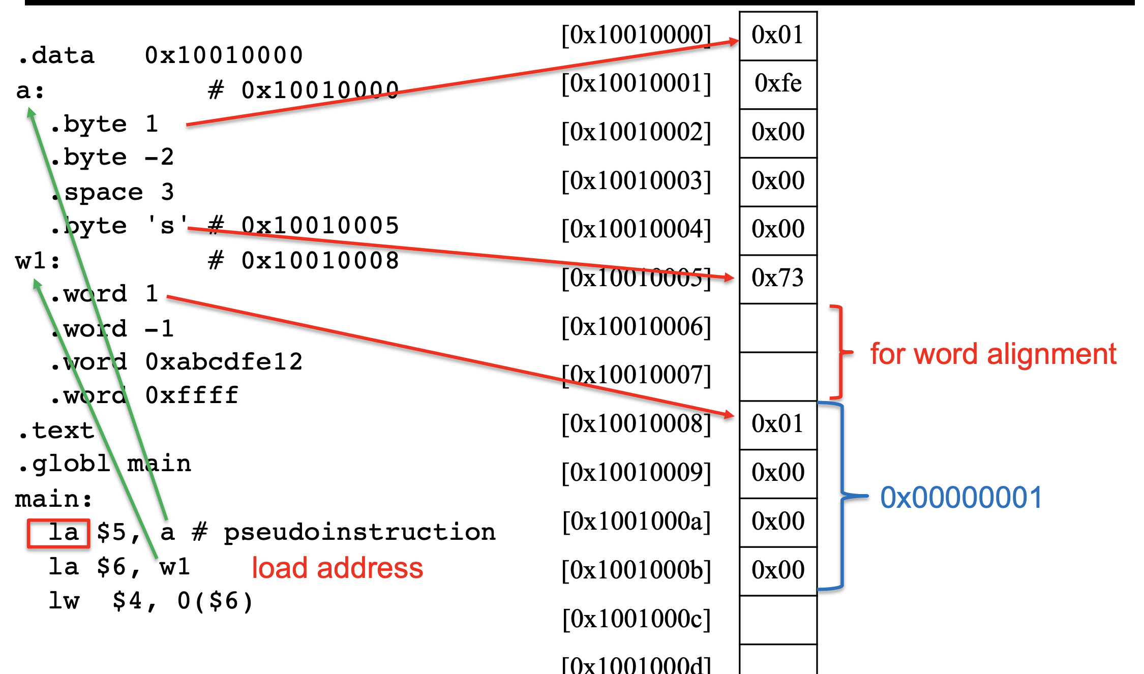 메모리에는 16진수로 저장 되는데, 이때에 메모리 한칸은 1byte = 8bit 이며 이가 표현 가능한 숫자의 수는 2^8이다. 이때에 2^8 = 16^2 와 같다 따라서 이는 16진수 두자리와 같다. 그리고 spim에 나타낼 때에는 4byte, word 단위로 나타낸다.