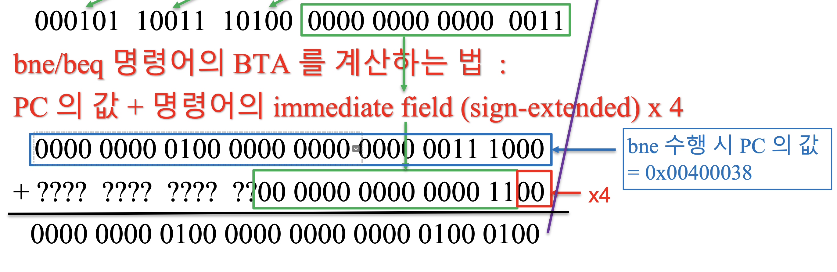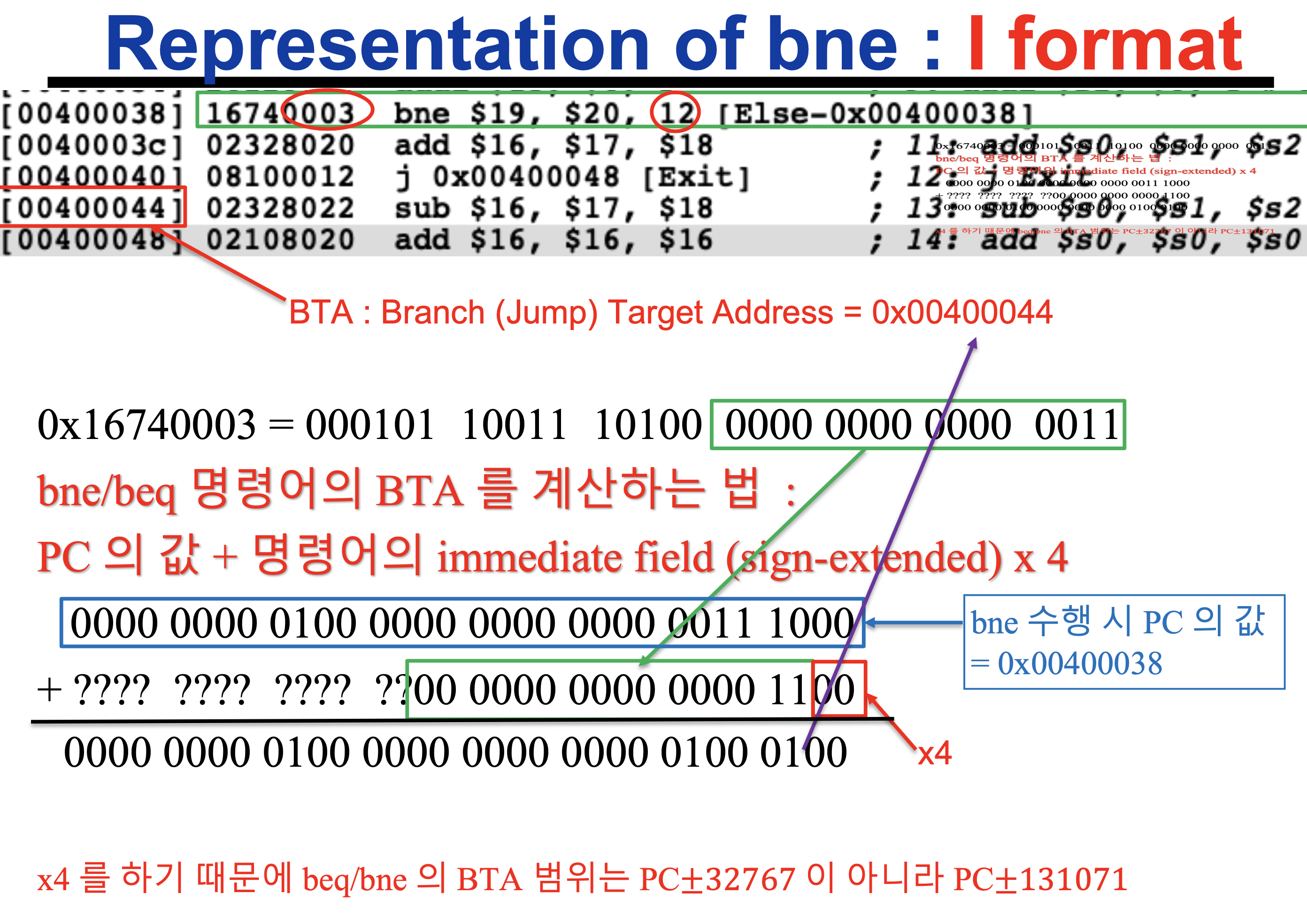 이러한 bne/beq를 나타낼때에는 i format 을 활용하는데, 작성할때에 명령어 와 레지스터는 똑같이 작성하고 immediate feild에 BTA를 저장하게 된다. 이떄에도 규칙이 존재한다.