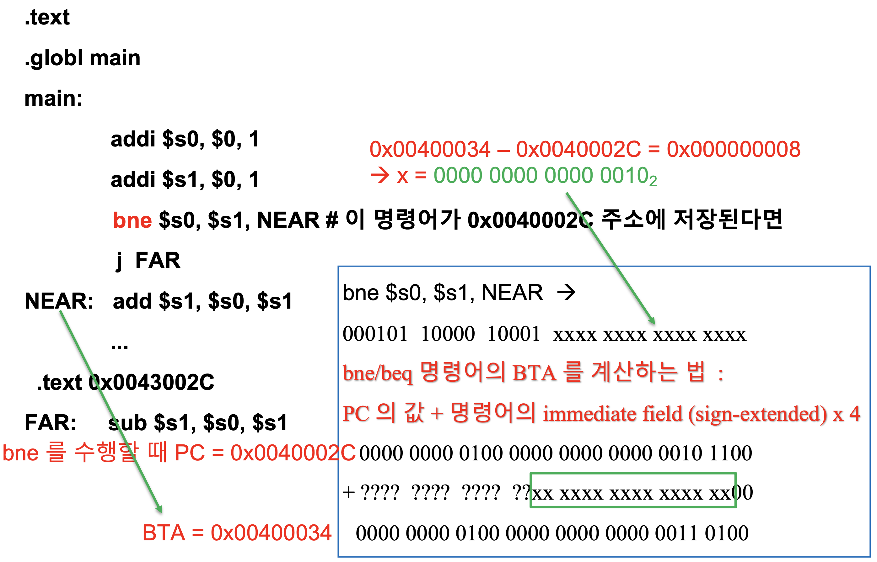 따라서 반대로 BTA의 주소를보고 bne/beq 를 완성 시킬수도 있다.