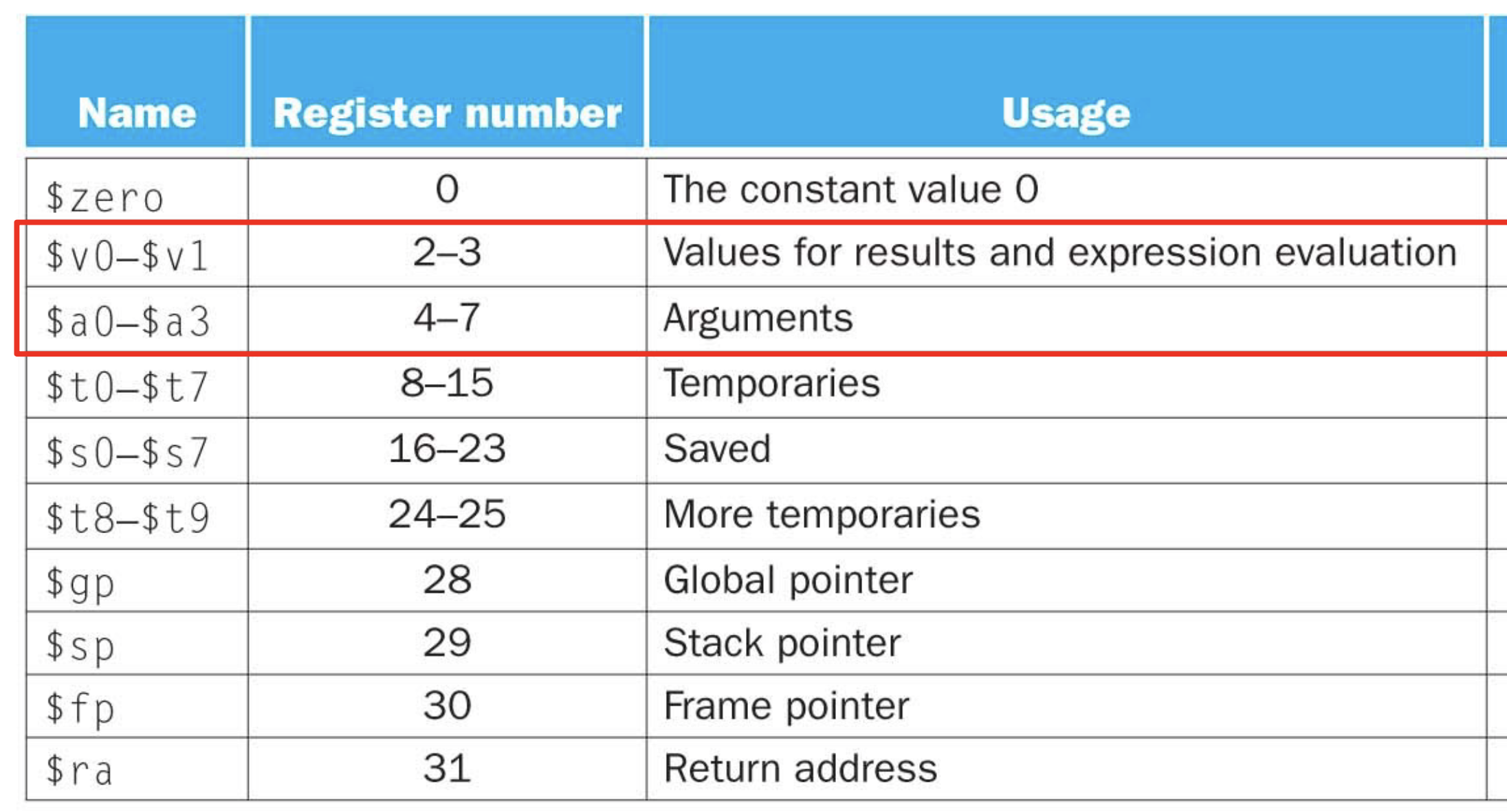 $zero 는 항상 0 이고, $2 - $3의 별명은 $v0 - $v1 으로 이 의미는 return 결과 같이거나, system call code 이다.