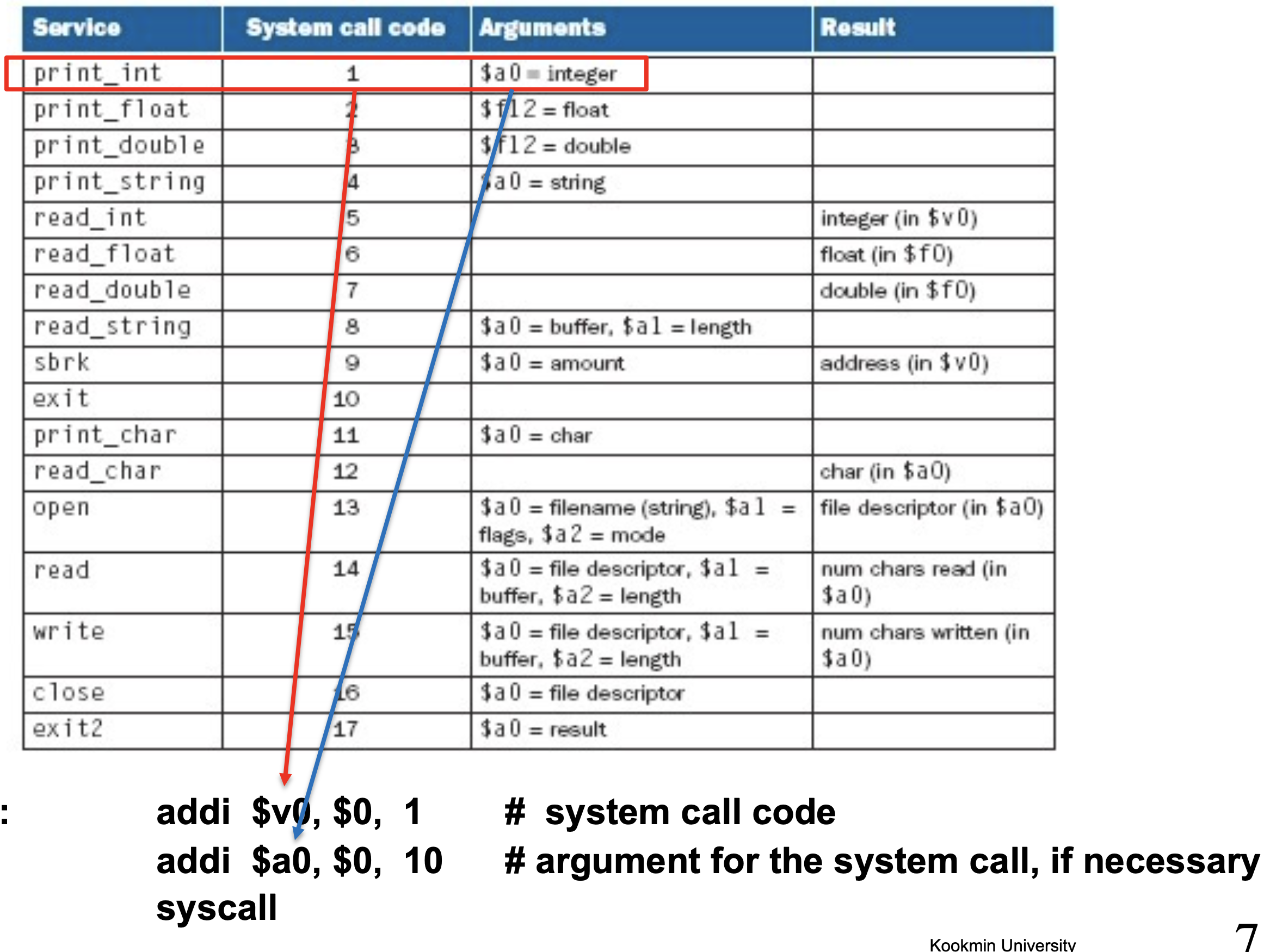 위에서의 system call code 의 의미는 syscall 을 수행 시킬때에 해당 코드에 따라 동작을 수행하는 것이다.