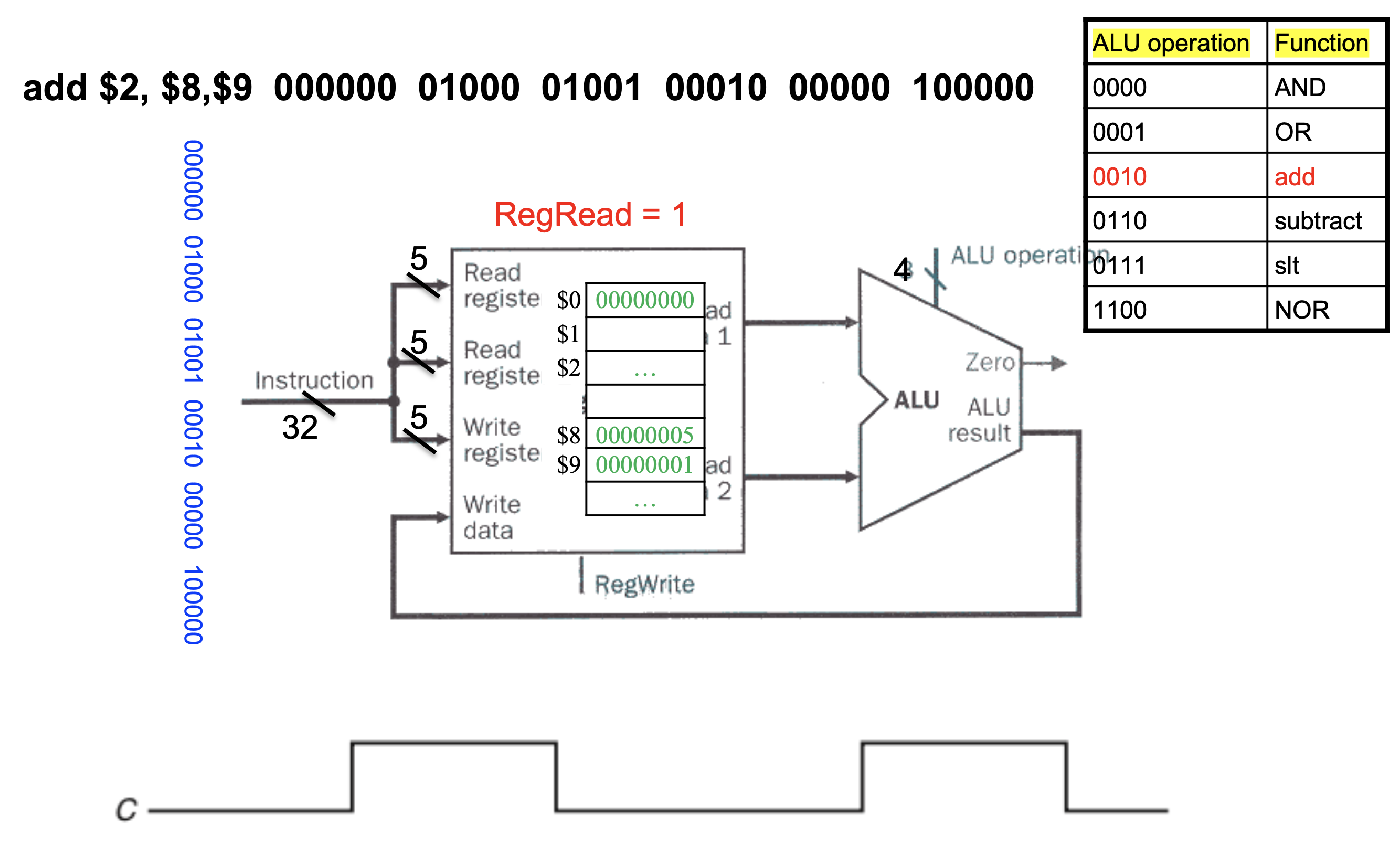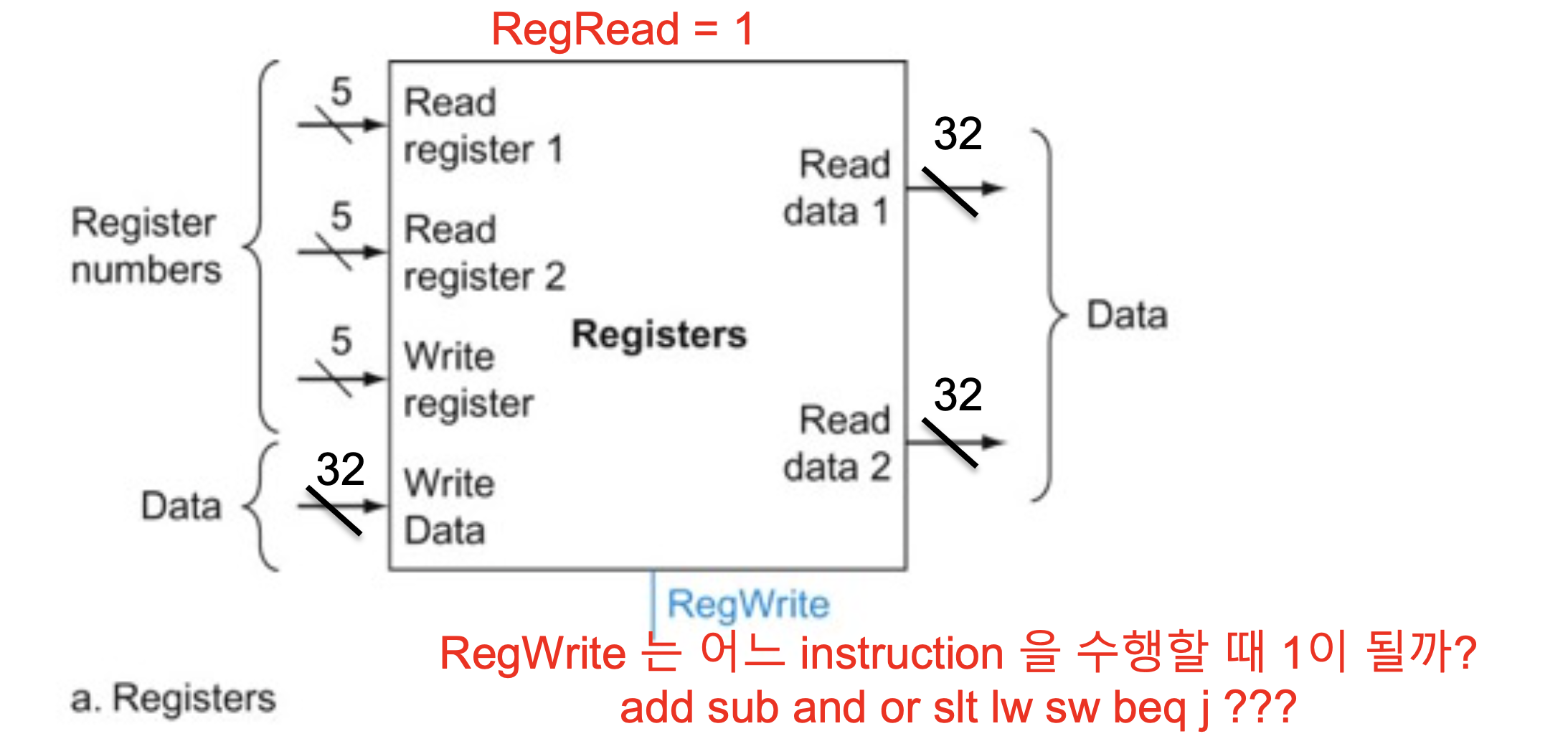 이때에 RegRead는 항상 1이고, RegWrite는 필요할 때, write register에 data를 입력해야 할 때에 1로 바뀐다.