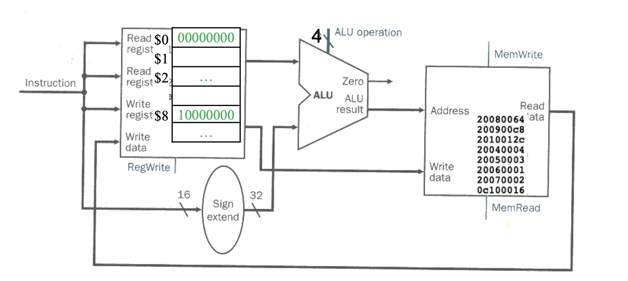 위는 instruction을 저장할 때이고, 읽을 때에는 memRead = 1, memWrite = 0 으로 설정한다.