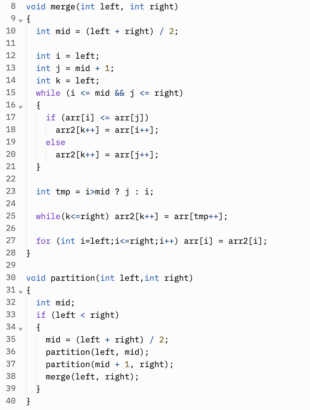 이에 최악의 경우에는 시간복잡도가 N^2이다. 이를 개선하여 처음부터 나누어진 수들을 합치면서 정렬을 한다. 나뉜상태에서 하기 때문에 NlogN으로 시간 복잡도가 일정하다.